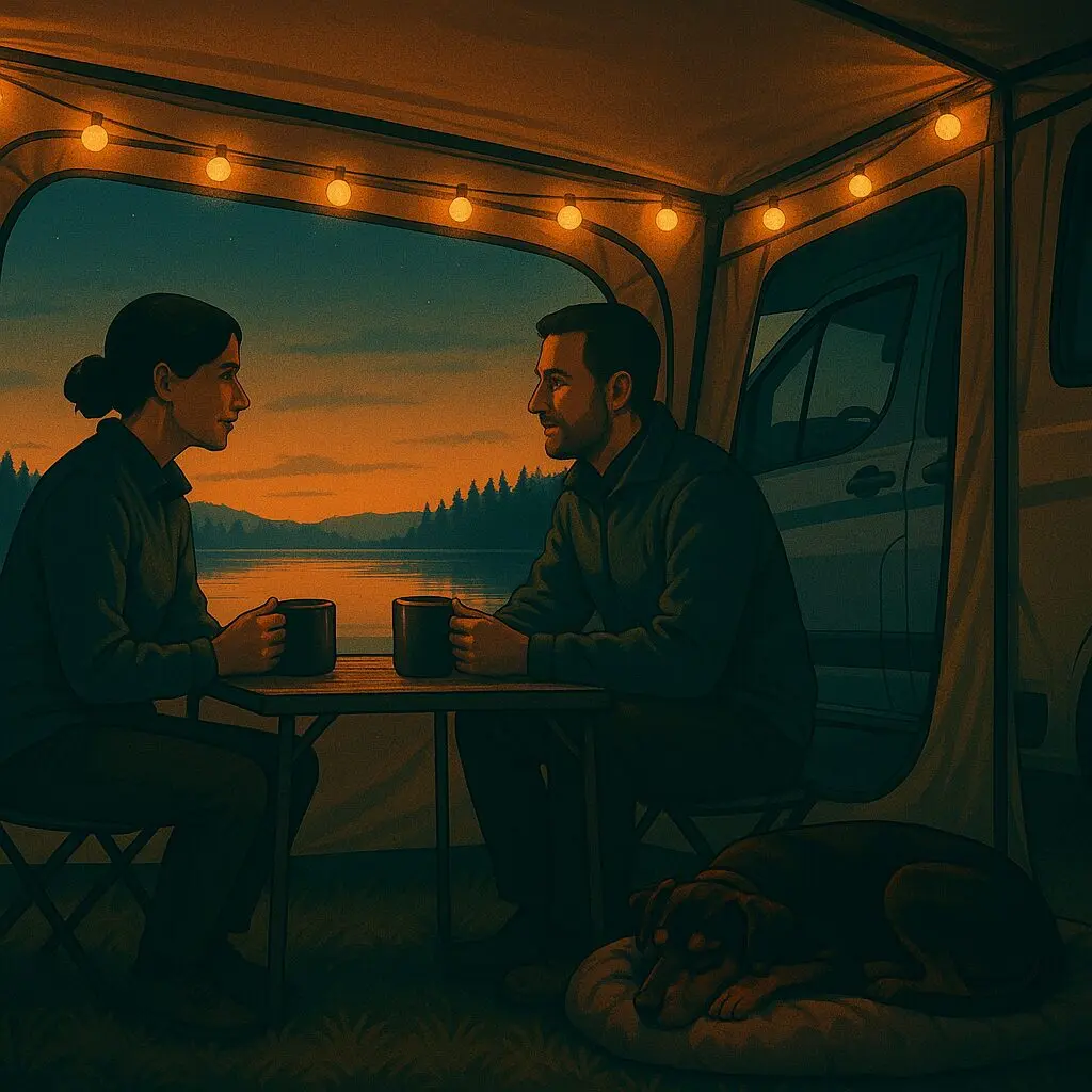 Wenn Licht ins Spiel kommt, halten wir es simpel: Eine kühle Outdoor-Lichterkette an der Markise genügt, dazu Stirnlampe für den Gang zum Sanitärbereich. Die Lichterkette ist robust, sparsam und schnell verstaut – und sie macht sofort dieses „wir sind angekommen“-Gefühl.