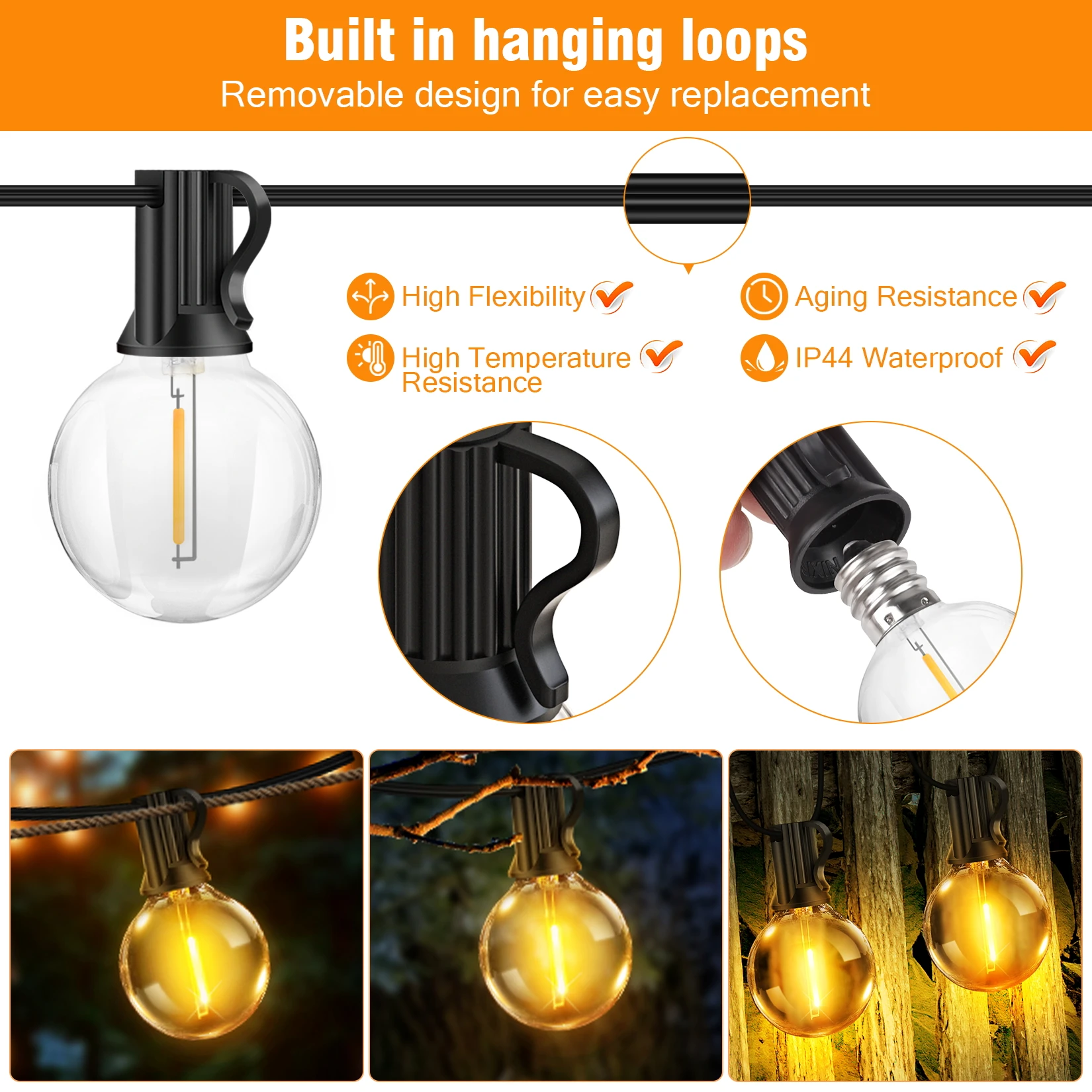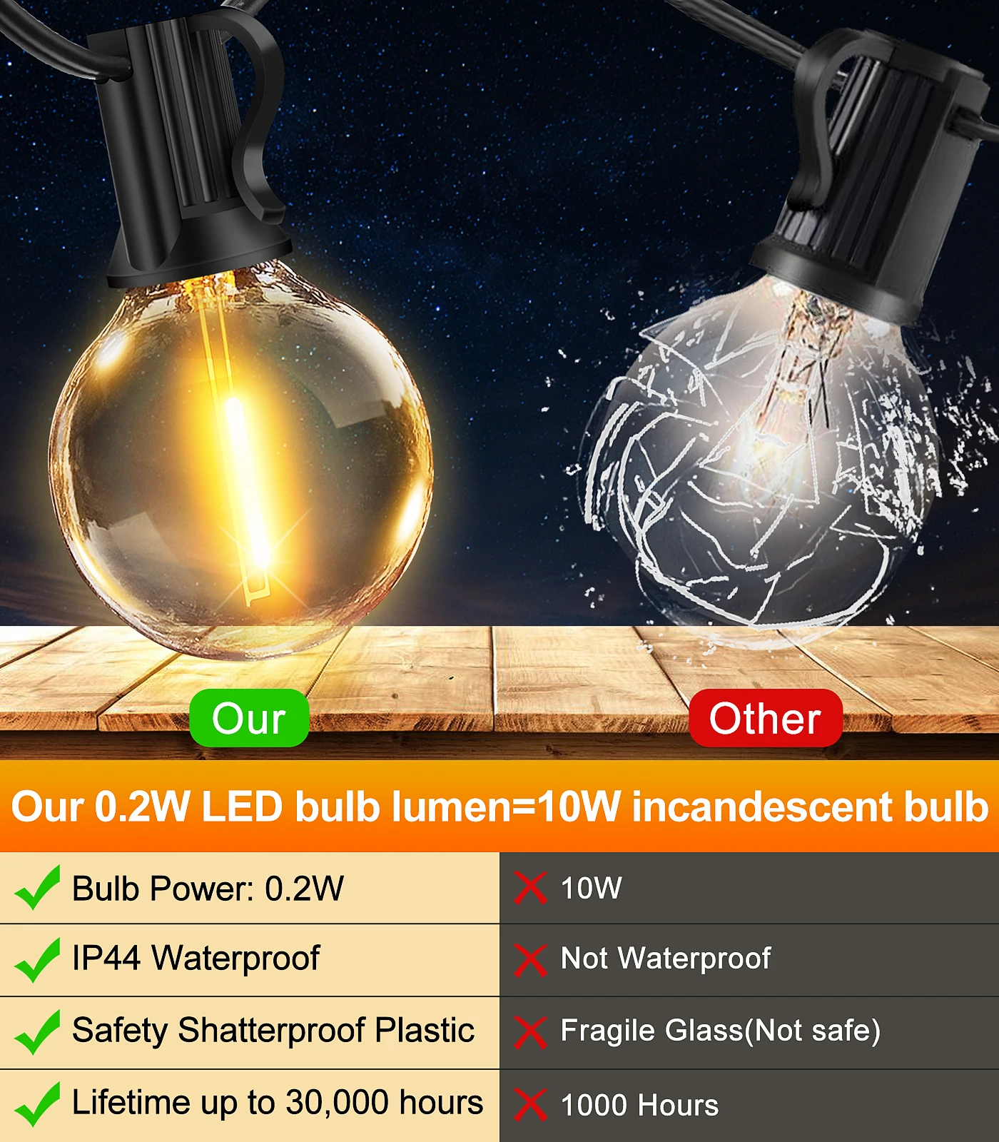 - Bruchsichere G40-Bulbs: robuste Kunststoffkugeln – keine Scherben, ideal für Familien & Camping.