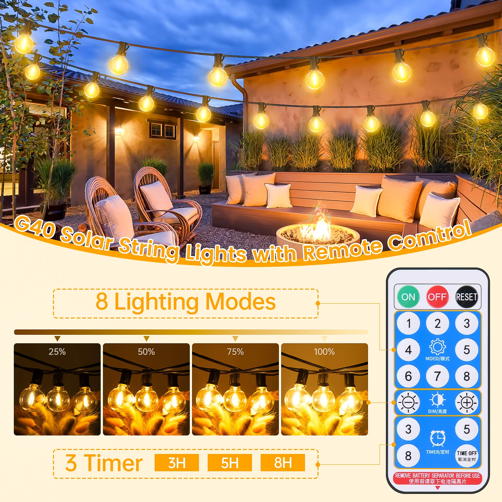 Stimmungsvolle Solar-Lichterkette (20 m) für Garten, Balkon, Camping & Hochzeit. Bruchsichere G40-Kunststofflampen, 8 Lichtmodi, Timer und Dimmfunktion per Fernbedienung. Wetterfest (IP45), CE & RoHS.