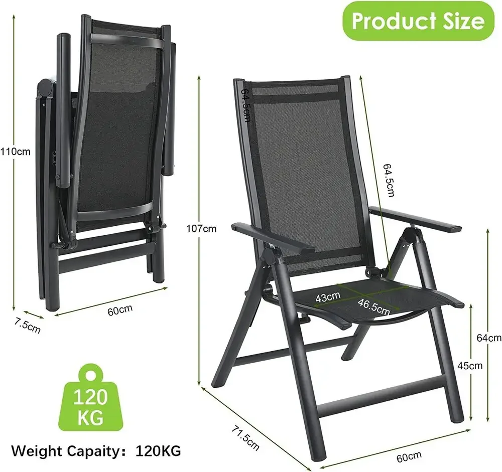 2er-Set Deluxe Gartenstühle – Aluminium-Klappstühle mit hoher Rückenlehne, 7-fach verstellbar, Armlehnen, Teslin-Sitzfläche, schwarz