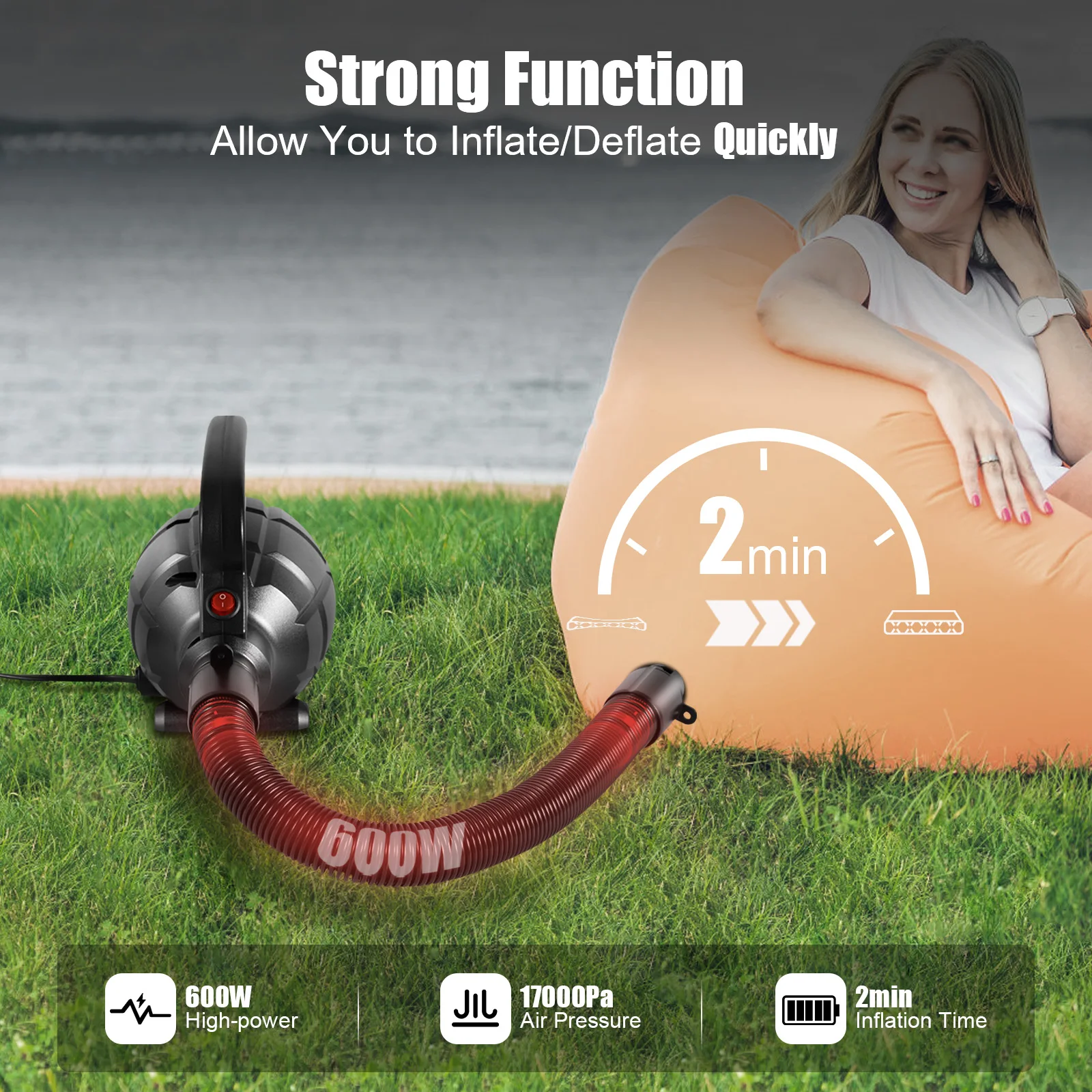 - Leistungsstarker 600 W Motor für zügiges Aufpumpen/Entlüften (typ. ca. 2 Min je nach Volumen).