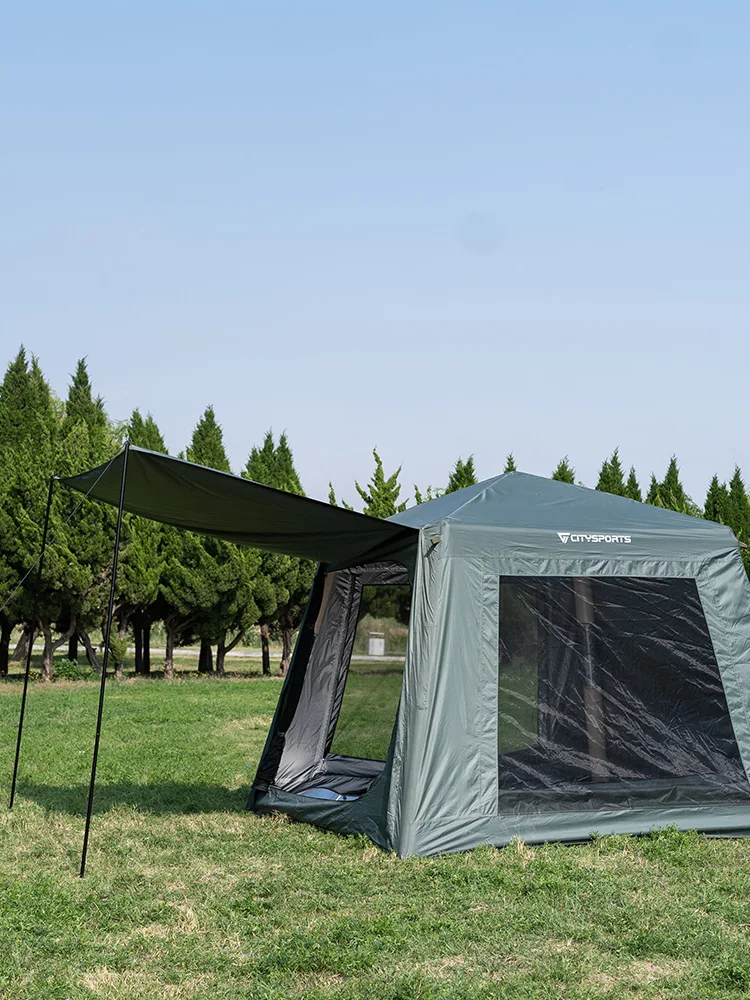 Das Zelt verfügt über verstärkte, windstabile Gestänge/Schläuche und hochfeste Abspannleinen und widersteht auch kräftigem Wind. Die Außenhaut ist mit einer professionellen, wasserdichten Beschichtung versehen; alle Nähte sind mit Hochtemperatur-Tape versiegelt. So bleibt der Innenraum selbst bei starkem Regen trocken – ideal für Outdoor-Camping bei wechselhaftem Wetter.