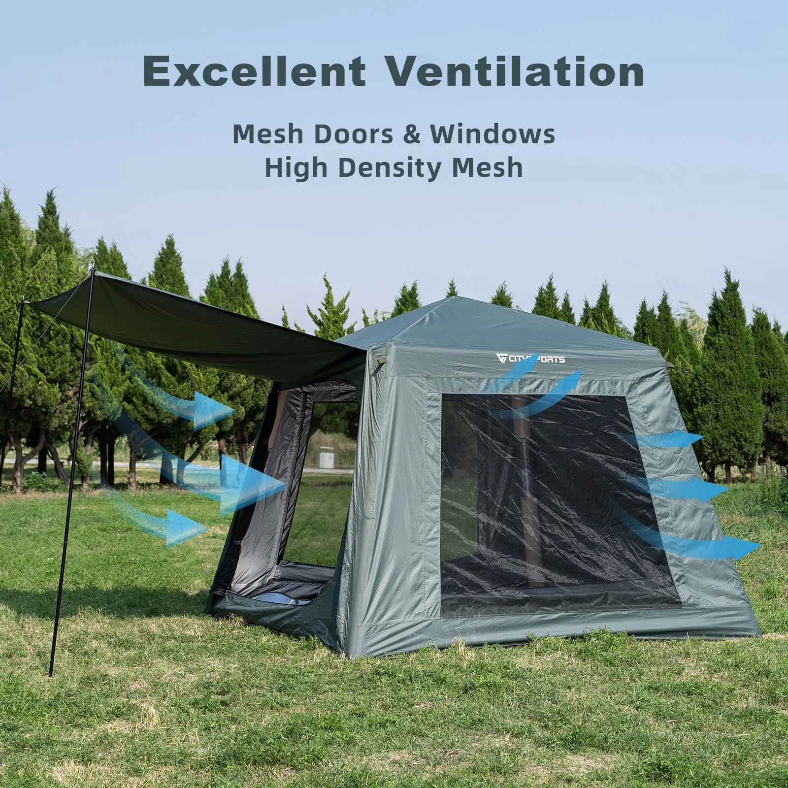 Zeltstoff mit UPF 50+ blockt schädliche UV-Strahlen und reduziert Hitzestau. Beidseitige, hochdichte Mückennetz-Fenster sorgen mit Reißverschlüssen für variable Belüftung – frische Luft hinein, Insekten draußen.